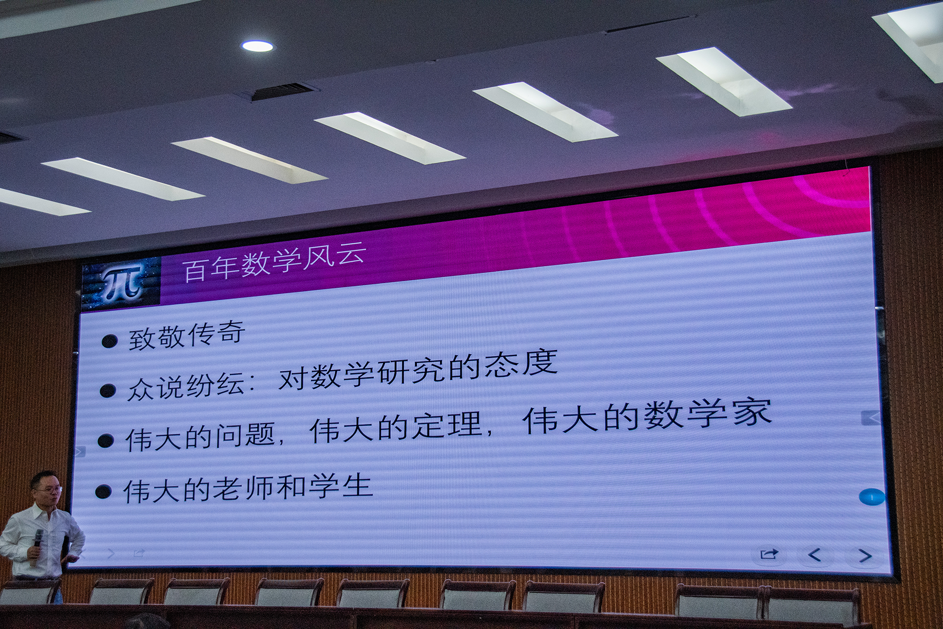 江宁教授以《大数学家的小故事——浓缩百年数学风云》为题展开讲座。他以时间为线,讲述了欧拉等诸多国内外数学界传奇人物的小故事及其背景。
