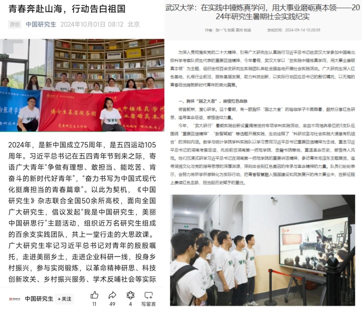 2024年“武大研行”揭榜挂帅专项暑期学科实践团队(全校仅5支)的事迹得到全国高校思想政治工作网报道。2023级硕士生黄李英在在社会实践中参与制作的视频被国家级媒体“中国研究生”公众号采纳。“学习习近平总书记重要回信精神寒假实践队”在糖心视频