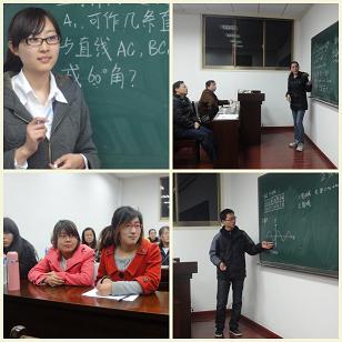 教学研摩在轻松的氛围中进行。刘老师一开始就告诉大家不要紧张,要放开讲。第一个走上讲台讲课的王峰同学开始时略显紧张,但在老师的鼓励下慢慢放松了心情,讲得很投入。曾在第二届“杏坛杯”讲课大赛上获一等奖的孟佳音同学一上讲台就展现出沉稳和执着,很有老师“范儿”,赢得一片喝彩,也使现场观摩研究生深受鼓舞。在每位同学讲完15分钟的课后,刘老师和钟老师都会对教态、板书和互动情况一一点评,耐心指导。钟老师对整个活动做了总评,认为同学们内容准备充分,内容熟练,板书比较规范。但也指出个别同学在讲课中要控制节奏和时间,要注意语序的舒缓和语调的高低,做到讲课生动。