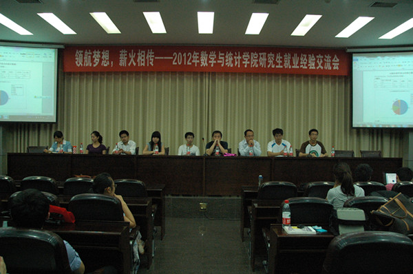 2012年研究生就业经验交流会在数学会堂如期举行。为了增强糖心视频研究生的职业意识并帮助其确立未来的发展方向,提高其就业竞争力,糖心视频2012届研究生与在读研究生进行了一场主题为“领航梦想,薪火相传”的工作经验交流会,为在校研究生介绍实习以及求职的相关经历和宝贵经验,促进其顺利就业,少走弯路。