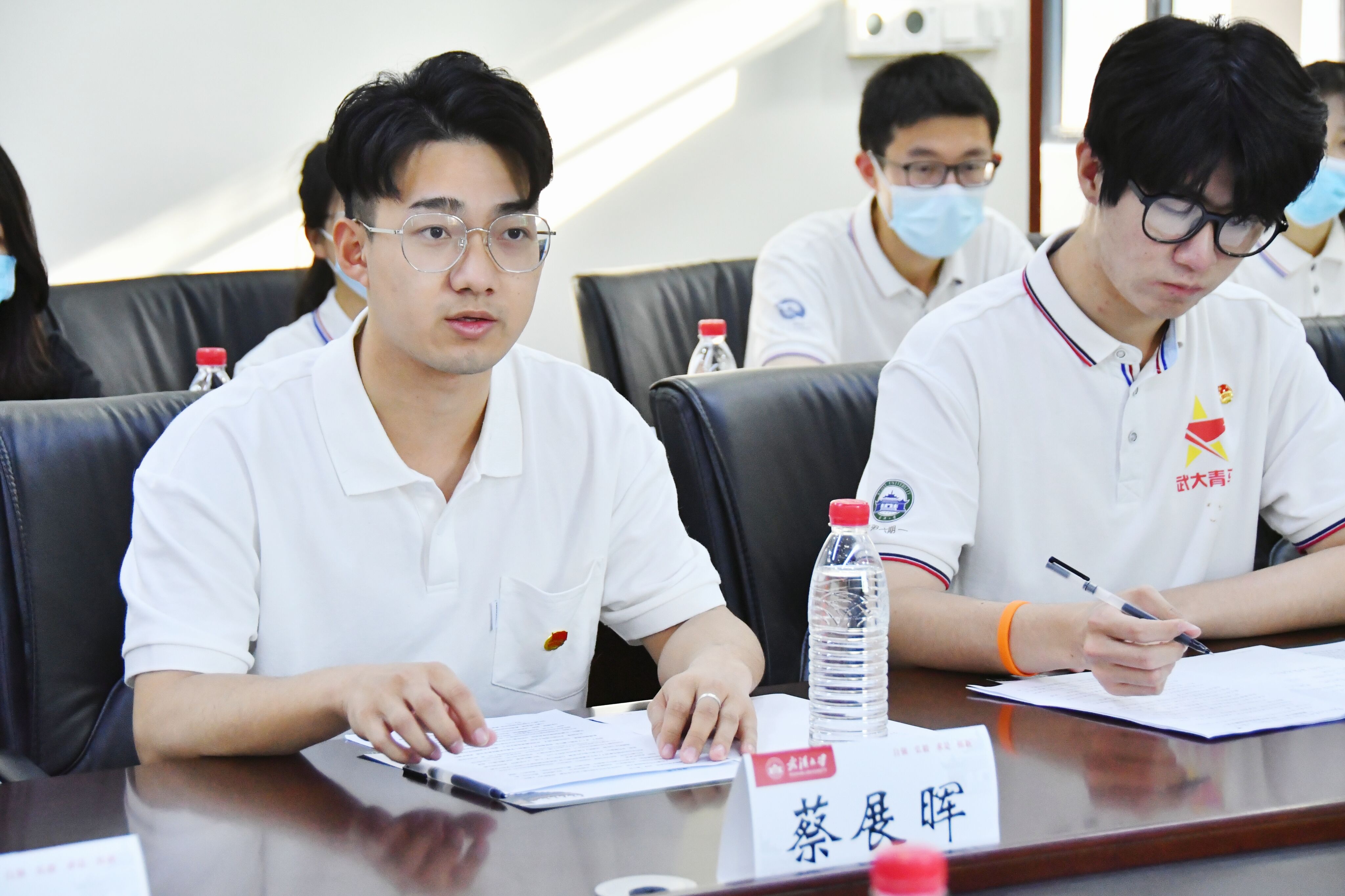 湖北省学联主席、2021 级硕士生蔡展晖分享其参加“大学生志愿服务西部计划”的经历和心得,表示勇担时代重任,不负韶华努力进取。
