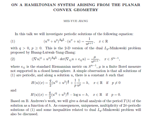 教授,主要研究领域为非线性分析与非线性微分方程,包括哈密顿系统周期解存在性,辛几何中Lagrange子流形相交问题的Arnold猜测,ROF泛函极小问题,1-Laplace算子的特征值问题等。承担多项国家自然科学基金面上项目和重点项目,在国内外重要学术期刊Ann.Inst.H.PoincareAnal.、Manuscript Math.、Calc. Var. Partial Differential Equations、JDifferential Equations、Proc. Roy. Soc.Edinburgh Sect. A等发表过多篇具有国际影响力的论文,也曾作为访问学者在多所国外高校和研究所访问交流。