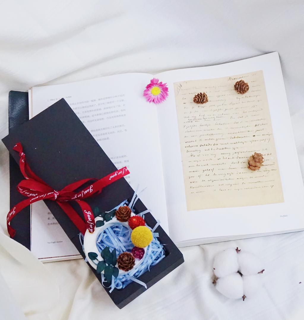 的赵同学将自己的蜡片命名为《胖虎的梦》,她的创作灵感是以为憨厚稳重的朋友,因此她的蜡片上没有浓烈的红色花朵,而用坚韧的松柏叶和圆润可爱的松果来展现这位朋友的特色。