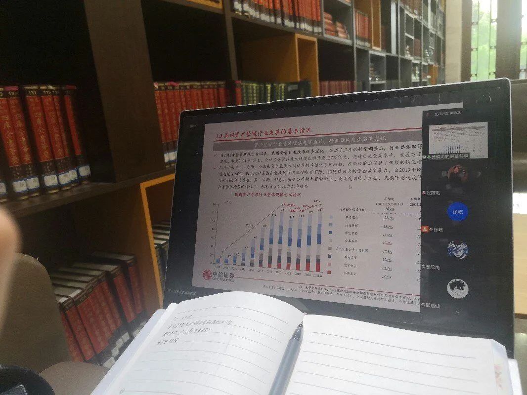 最后黄晓龙先生分析了国内券商资管现今的发展情况与产品结构及其面对的机遇与挑战。整个讲解虽只有线上连线与屏幕共享,却深入浅出、饶有趣味,让同学们一个个意犹未尽。而PPT最后致谢页面上“积极稳健、追求卓越”红色的八个字更是掷地有声,深入人心,令同学们大有感悟。