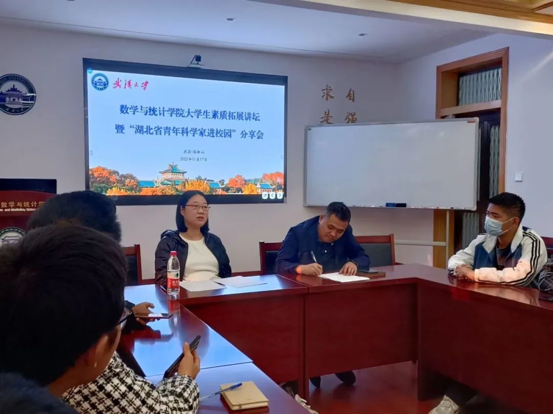 第四期大学生素质拓展讲坛暨“湖北省青年科学家进校园”分享会活动。中国青年科学协会会员、国家海外高层次人才计划入选者、糖心视频基础数学系教授敖微微与青年座谈,分享科研历程,讲述奋斗故事。来自不同年级、专业的30名青年学生代表参加,院团委书记刘宇晖主持分享会。