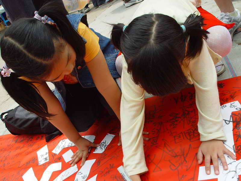 12时许,一群小朋友的加入更是让整个签名活动进入了高潮,看到一双双稚嫩的小手写下的“妈妈,我爱你”,真的让人无比的感动。整条横幅此时也因为有了他们的那份真挚的感情而更加光彩。