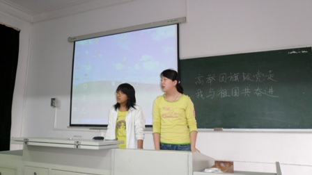 4月24日下午5点,由05基地团支部和05统计团支部联合举办的以“高举团旗跟党走,我与祖国共奋进”的主题团会在教三402举行。