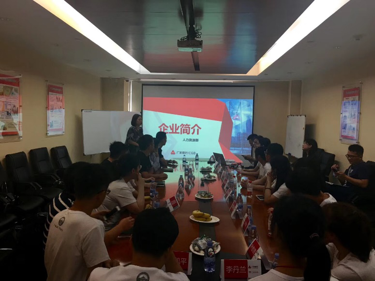 16:10我们抵达珠江新城。16:20,我们一行人来到了广发银行为我们准备的会议室,同在会议室的还有广发银行信用卡中心的员工,其中包括武大的校友们。首先,由人力资源部总监给我们介绍了广发银行,包括银行的发展历史、行业动态、业务内容以及岗位人才需求。广发银行成立于1988年,是国内首批组建的股份制商业银行之一。广发银行秉持“诚信、责任、创新、笃行”的核心价值观,牢记“服务客户、回报股东、成就员工、奉献社会”的历史使命,践行“相知相伴、全心为您”的服务理念,朝着实现“全国一流商业银行”的战略目标奋勇前进。同时,它正在向互联网银行转型。在信用卡业务上,项目经理详细介绍了贷前审批、贷中管控、贷后催收的一系列流程。在人才招聘上,招聘经理告诉我们,广发银行十分重视人才的自主学习能力、逻辑思维能力和创新能力,与传统的金融学专业学生相比,理工科学生在很多岗位上占据优势。面试环节中考察内容大部分为数学和计算机相关知识。