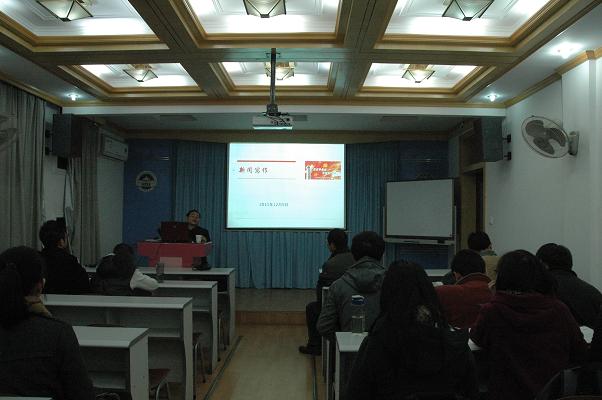 本次培训的嘉宾为校党委宣传部副部长胡庆方老师。在两个小时的讲座培训中,胡老师将新闻写作分成五部分加以介绍。在每一部分中,胡老师都举出一个个同学们耳熟能详的事件及相应的新闻稿件来详细说明。胡老师的旁征博引让同学们对新闻写作的要点有了一个深刻的认识。