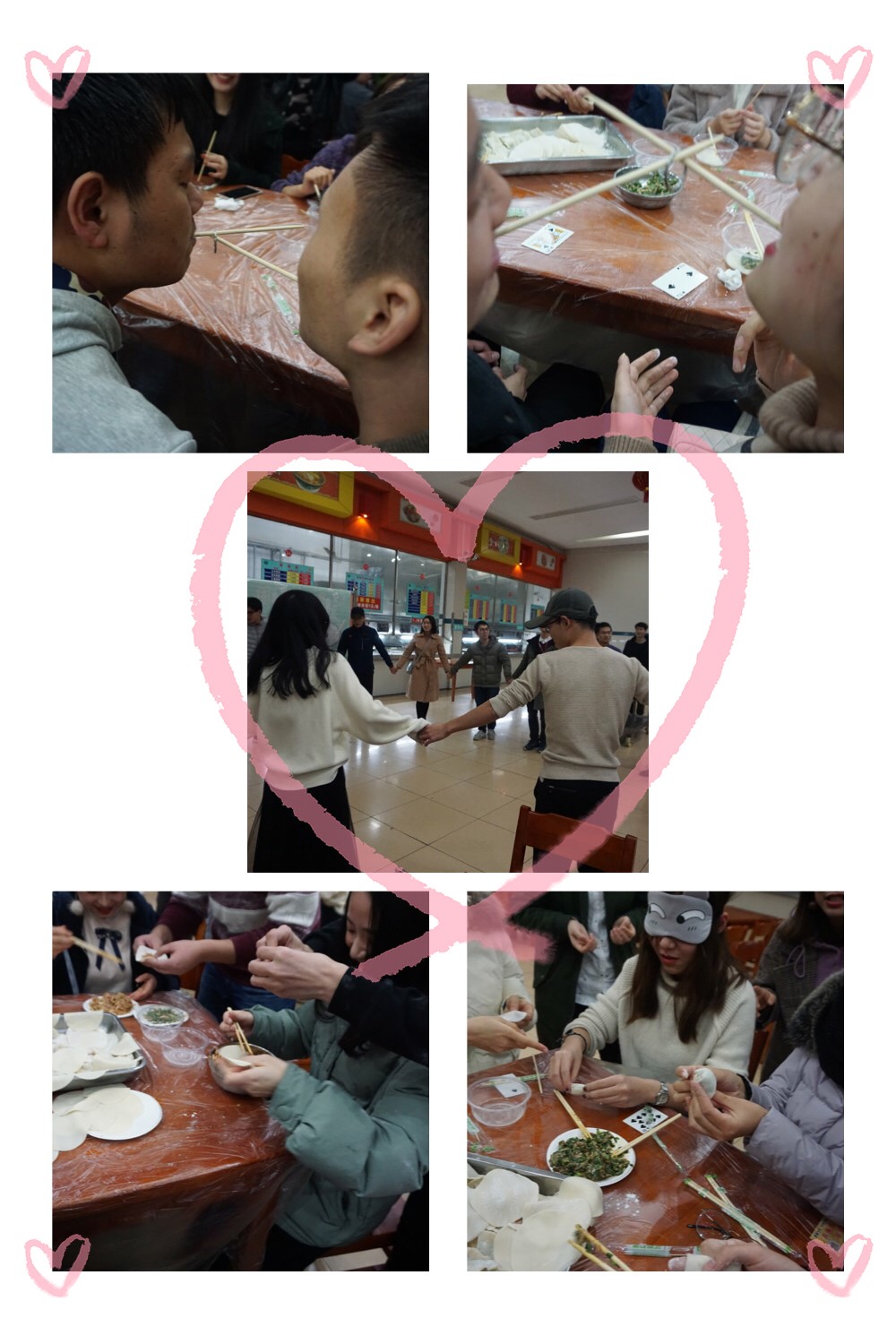 “筷子传情”这个热身活动使现场的气氛逐渐活跃,同学们也对包饺子环节跃跃欲试。在工作人员提供了饺子皮和饺子馅之后,大家便开始尝试将饺子设计成各种形状。与此同时,活动也在继续,蒙眼包饺子、男女合作包饺子、包饺子接力等拉近了同学之间的距离。第一锅饺子也在大家的欢声笑语中被端上了桌子,吃着自己包的饺子,讨论着各自家乡的文化传统,互相了解彼此的饮食习惯,尽管外面寒风瑟瑟,但此时大家相聚在一起却倍感温暖。