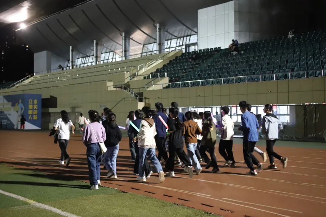晚上19:30,夜跑正式开始。在领跑员的带领下,同学们站上跑道。随着一声令下,人群奔涌而出,恰似星河流淌,成为一道道亮丽的风景。不多时,操场上便遍布同学们的欢声笑语,荧光处处,又如群星散于星河。一段时间的夜跑后,我们也为同学们准备了农夫山泉和巧克力,以补充能量。