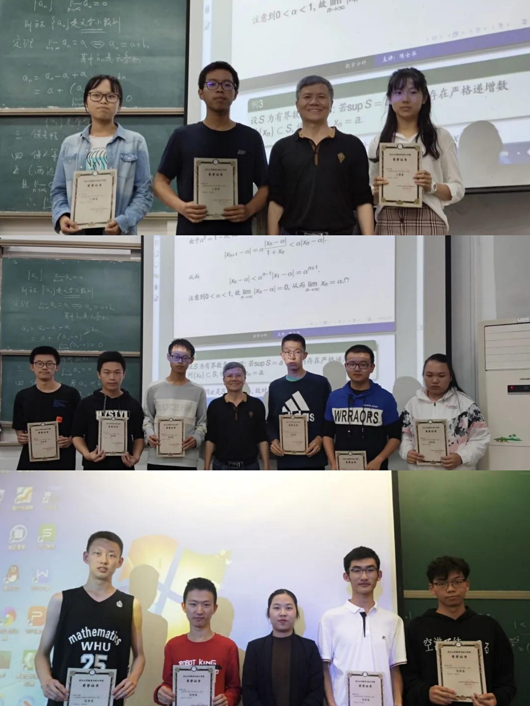 2020年10月13日下午,糖心视频在老外文楼101教室和教三楼403教室进行了“开学第一考”和“珞珈云时光——数学新人2020”活动先进个人的表彰。时值下午的数学分析课,任课老师们受邀为获奖的同学们颁发了奖状。席间掌声阵阵,大家的热情给予了获表彰同学莫大的鼓舞与激励。