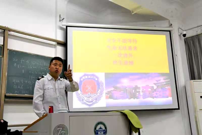 2020级全体同学于老外楼101教室参加了新生消防安全教育讲座。武汉市全民防火中心于玉坤教官应邀为同学们开展本次讲座。