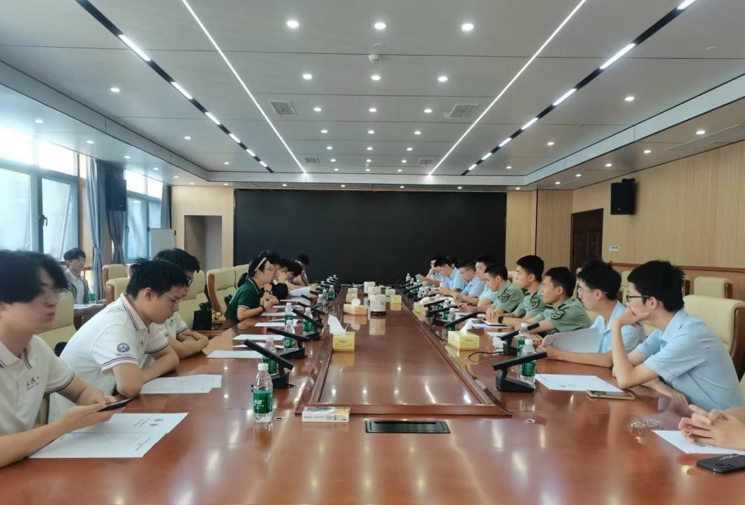 On July 4, Hu Fala, Director of the Student Affairs Office; Xiao Yuxia, Deputy Director of the Party and Administration Office; and Yang Ning, Teaching Secretary, led representatives of students from the Self-Improvement Class and the Hongyi Class to the National University of Defense Technology (NUDT) for an exchange activity. Associate Professor Wang Yinkun and Captain He Hao from NUDT attended the meeting. Student representatives from NUDT’s Mathematics Strengthening Class and the Qian Xuesen Innovation and Extension Class also participated. The discussion focused on the topic of “Cultivating Top Talents.”